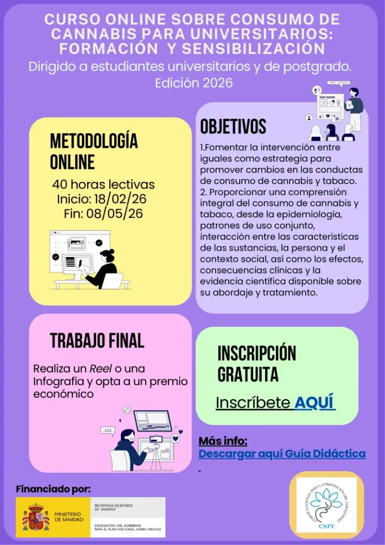 El curso online sobre consumo de cannabis para universitarios/as: formación y sensibilización del Comité Nacional para la Prevención del Tabaquismo (CNPT). Es un curso gratuito financiado por el Plan Nacional sobre Drogas de 40 horas lectivas. Se imparte desde el 18 de febrero hasta el 8 de mayo y los objetivos son:
